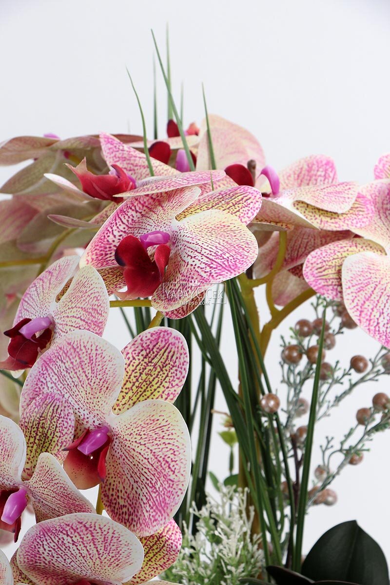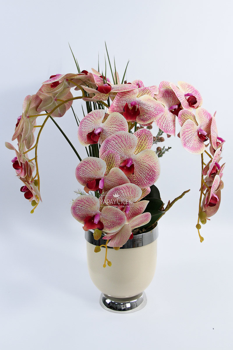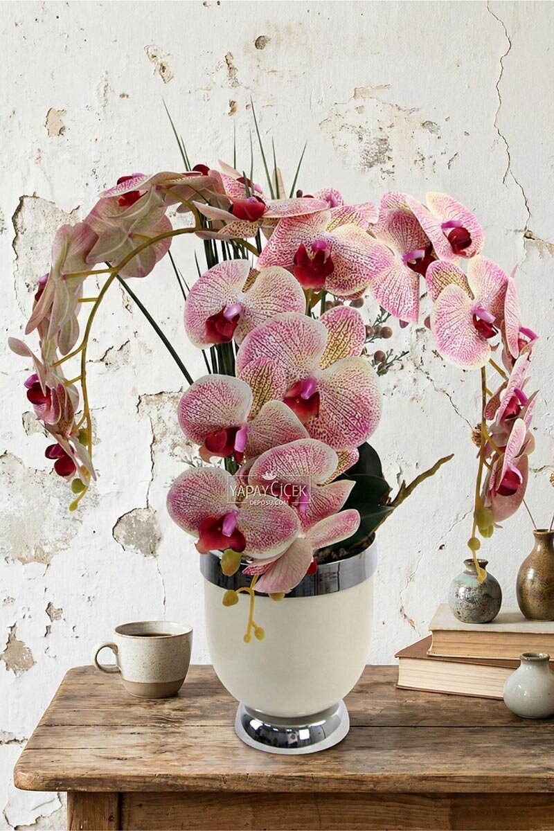 Metal beyaz-gümüş saksı içerisinde yer alan Lüx 3’lü Yapay Orkide Tanzimi, krem ve fuşya tonlarının zarif uyumuyla mekânlara sofistike ve modern bir hava katar. Gerçekçi dokusu ve dolgun formu sayesinde bulunduğu ortamda güçlü bir dekoratif etki oluşturur.
