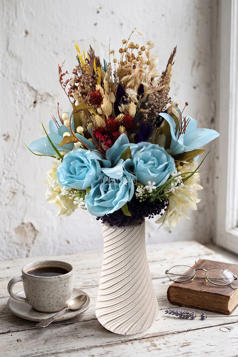 Zarif ve modern çizgileriyle tasarlanan Safir Güz tanzimi, beyaz sarmal vazonun şık duruşuyla birleşerek bulunduğu ortama ferah ve estetik bir görünüm kazandırır. Dengeli çiçek yerleşimi ve doğal renk uyumu sayesinde dekorasyonda dikkat çekici bir tamamlayıcıdır.