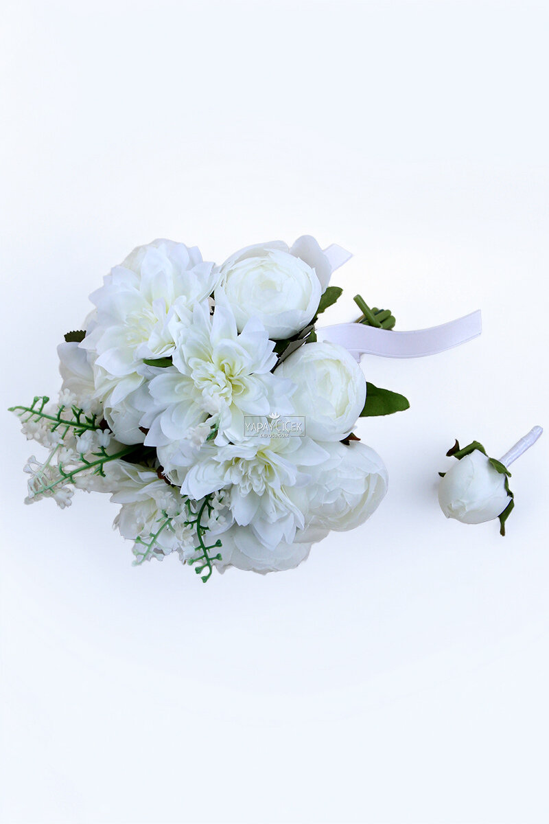 Set İçeriği: Gelin buketi ve uyumlu damat yaka çiçeği