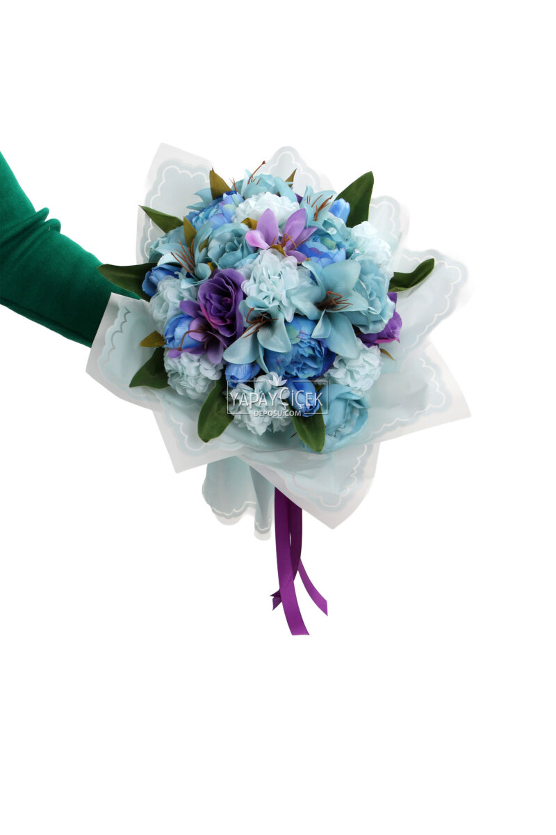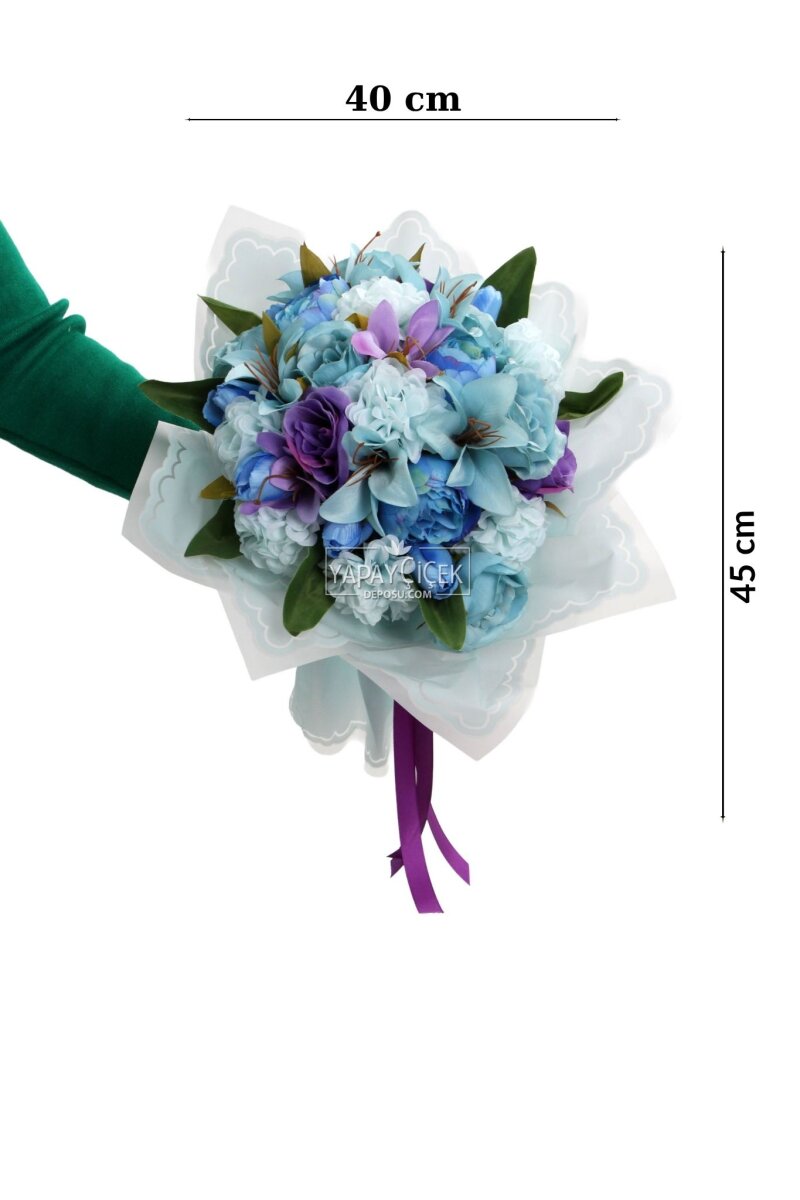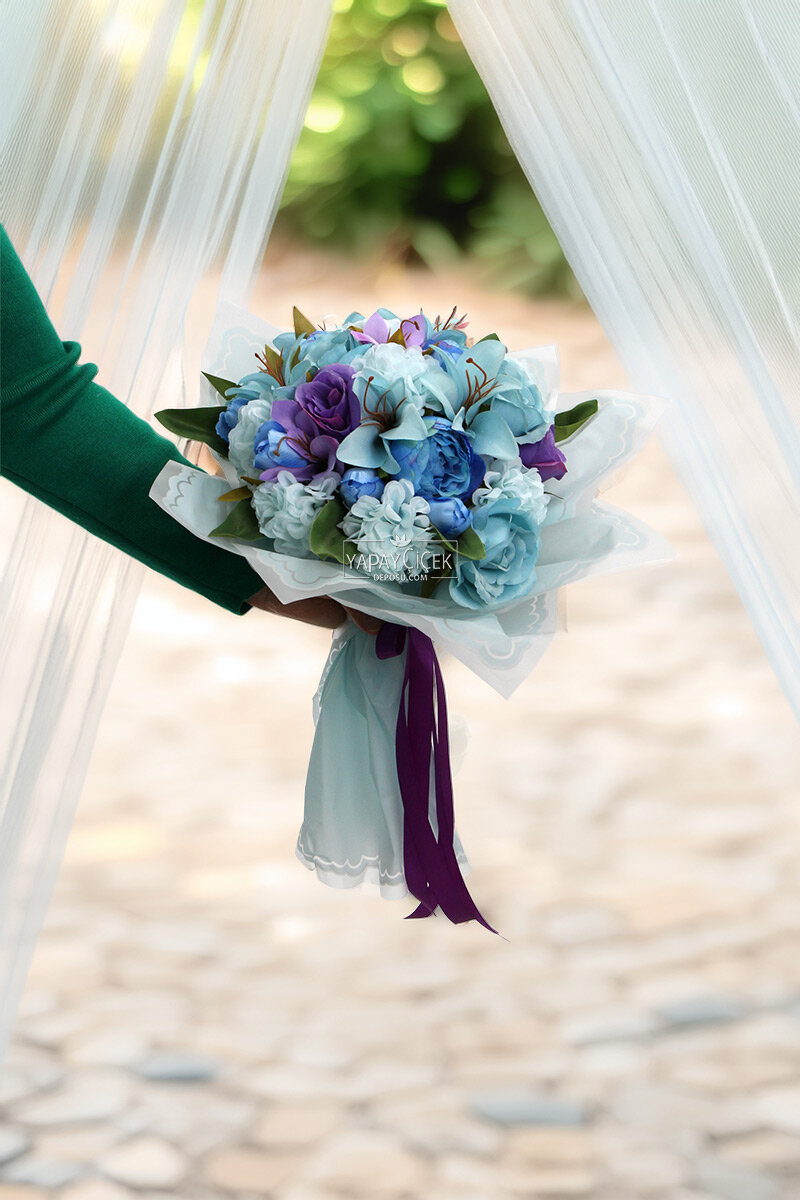Özel günlerinize zarif ve romantik bir dokunuş katacak Mavi yapay gelin buketi, göz alıcı renkleri ve şık tasarımıyla unutulmaz anlarınıza eşlik edecek. Yapay çiçek olması sayesinde yıllarca bozulmadan saklanabilir, böylece söz, nişan, isteme gibi özel anlarınızı her zaman hatırlatacak değerli bir hatıra olarak kalır. Estetik ve zarif görünümüyle her konsepte uyum sağlayan bu buket, romantizmin ve zarafetin mükemmel birleşimini sunuyor. Buketim çapı 48 cm Buketin Yüksekliği 50 cm