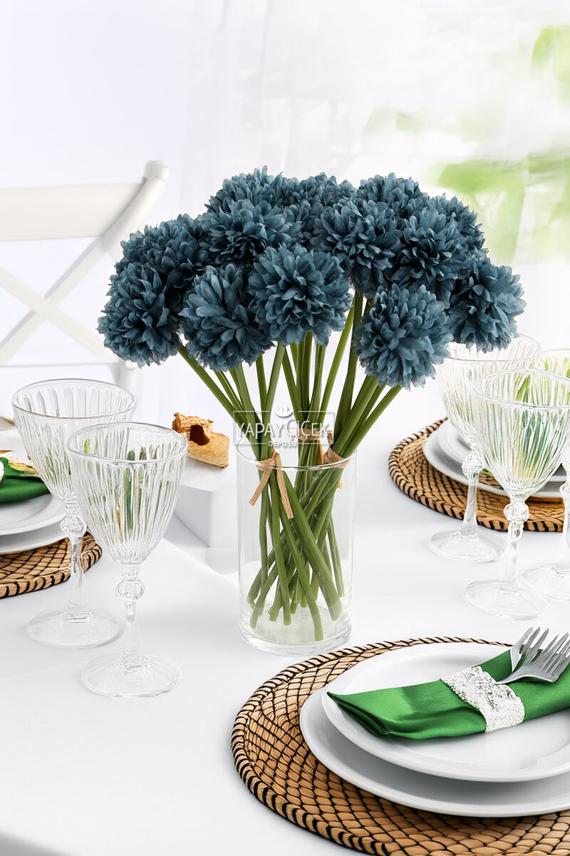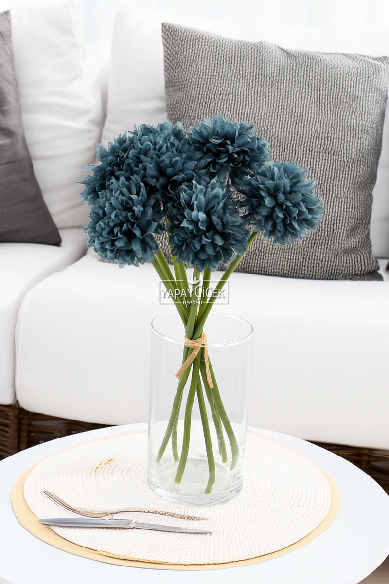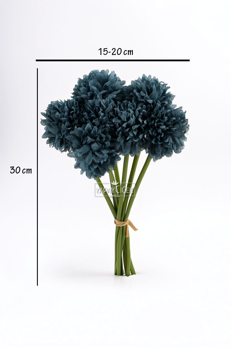 Yapay Çiçek Top Krizantem 7li Mini Kartopu Demeti 30 cm Petrol Mavi