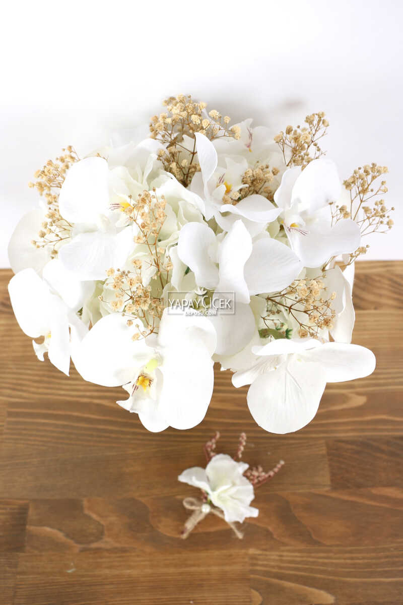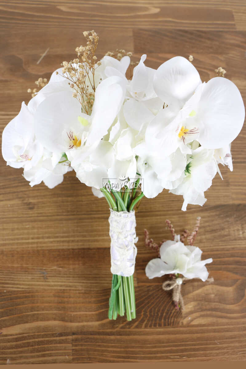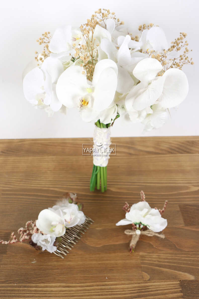 Paket içeriği: 1 adet gelin çiçeği, damat yaka çiçeği ve Gelin tacı Phalaina Yapay Gelin Çiçeği 3lü Set; ağırlıklı olarak real touch yapay orkidelerden oluşur. Gelin Buketleri Kişiye özel hazırlandığı için iadesi alınamaz.