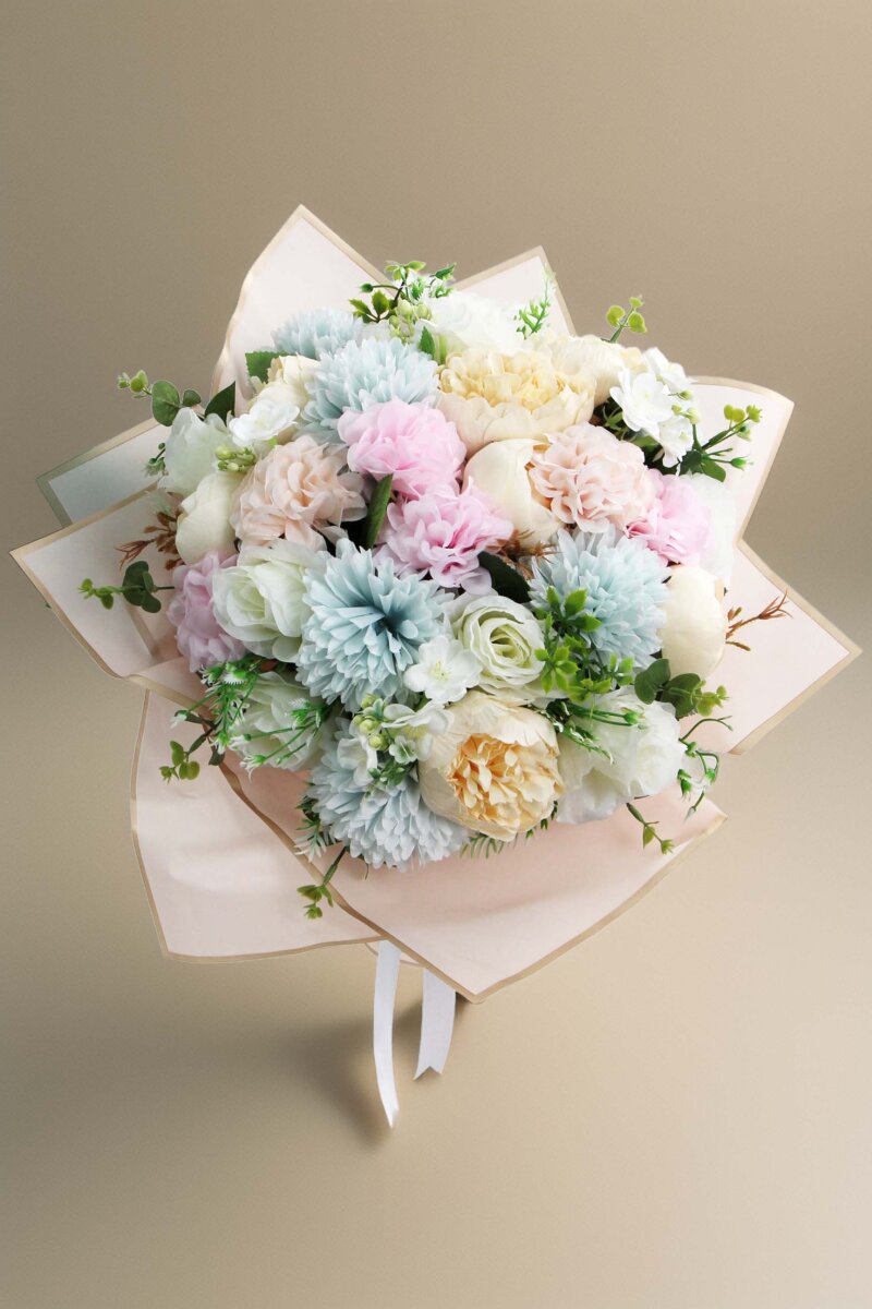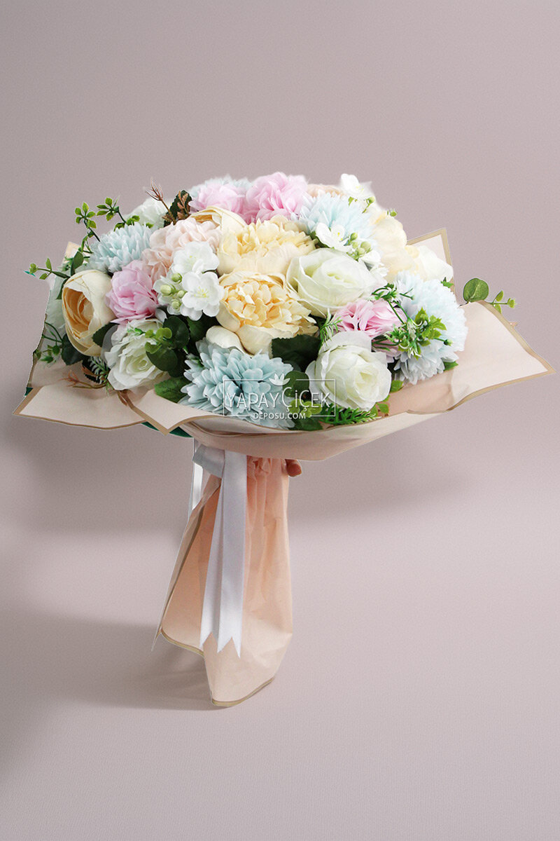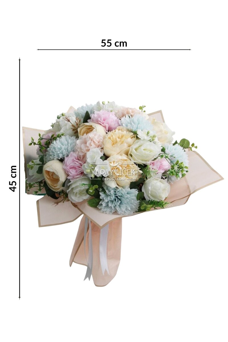 Özel günlerinize zarif ve romantik bir dokunuş katacak Mavi yapay gelin buketi, göz alıcı renkleri ve şık tasarımıyla unutulmaz anlarınıza eşlik edecek. Yapay çiçek olması sayesinde yıllarca bozulmadan saklanabilir, böylece söz, nişan, isteme gibi özel anlarınızı her zaman hatırlatacak değerli bir hatıra olarak kalır. Estetik ve zarif görünümüyle her konsepte uyum sağlayan bu buket, romantizmin ve zarafetin mükemmel birleşimini sunuyor. Buketim çapı 55 cm Buketin Yüksekliği 45 cm