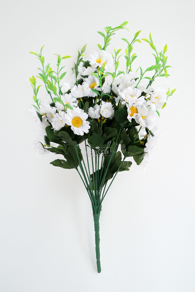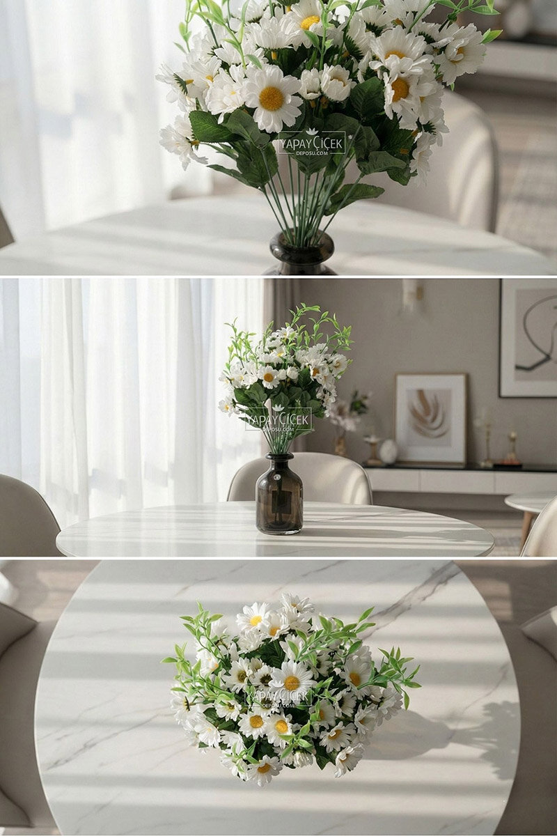 Yapay 18 Dal İri Papatya Demeti, iri çiçek başları ve dolgun yapısıyla dekorasyonlara ferah ve doğal bir görünüm kazandırır. Geniş hacmi sayesinde tek başına vazo içerisinde güçlü bir duruş sergiler; farklı yapay çiçeklerle kombinlenerek zengin aranjmanlar oluşturulabilir. Bakım gerektirmeyen yapay yapısı ile solma ve dökülme yapmaz, uzun süre ilk günkü formunu korur. Ev, ofis, vitrin ve organizasyon dekorasyonları için ideal bir tercihtir.