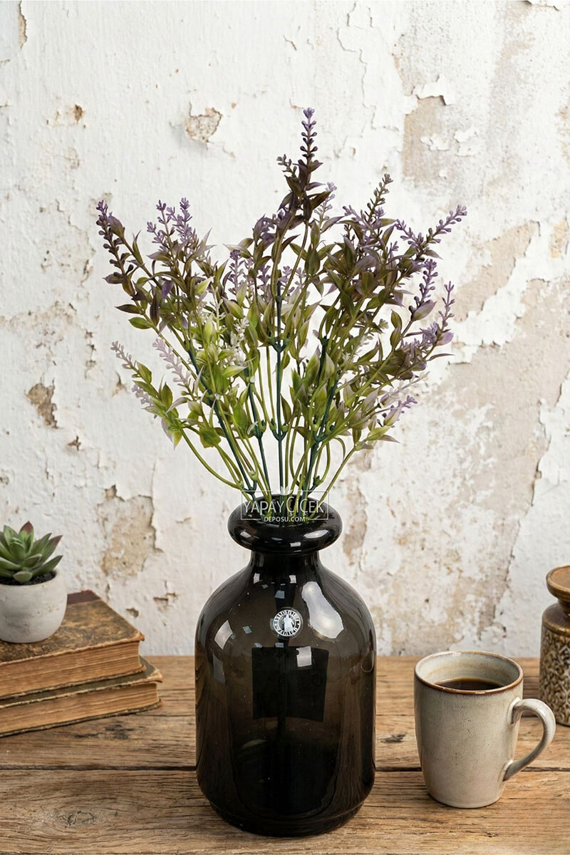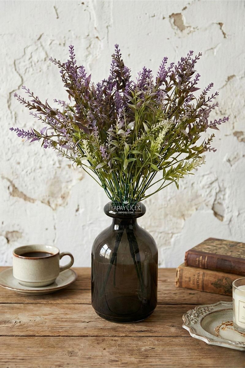 Yapay Bitki 5 Dallı Püsküllü Lavanta Demeti, zarif püsküllü çiçek formu ve doğal görünümüyle bulunduğu ortama ferah ve romantik bir atmosfer kazandırır. İnce ve hareketli yapısı sayesinde vazolarda tek başına kullanılabilir ya da aranjmanlara tamamlayıcı olarak eklenebilir.
