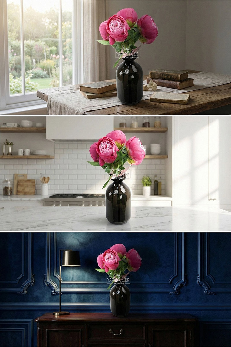 Yapay Çiçek 5’li İri Lüx Şakayık Gül Demeti, iri çiçek başları ve lüks görünümlü yapısıyla dekorasyonlara gösterişli ve zarif bir hava katar. Dolgun formu sayesinde tek başına vazo içerisinde şık bir duruş sergiler; farklı yapay çiçeklerle kombinlenerek zengin aranjmanlar oluşturmak için de uygundur. Bakım gerektirmeyen yapay yapısı ile solma yapmaz, uzun süre ilk günkü estetik görünümünü korur. Ev, ofis, vitrin ve özel gün dekorasyonları için ideal bir tercihtir.