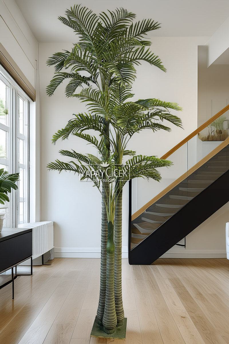 Yapay Ağaç Büyük 3 Gövde Dev Areka Palmiyesi 350 cm, iç mekân dekorasyonuna tropikal bir hava katmak isteyenler için etkileyici bir seçenektir. Üç güçlü gövdesi ve geniş yapraklarıyla gerçek areka palmiyesinin doğal görünümünü birebir yansıtır. 350 cm’lik devasa boyu sayesinde otel lobileri, alışveriş merkezleri, ofisler veya geniş yaşam alanlarında dikkat çekici bir odak noktası oluşturur. Yapay olması sayesinde bakım gerektirmez, yaprak dökmez ve uzun yıllar boyunca canlılığını korur. Estetik görünümüyle mekâna ferahlık ve doğallık hissi verirken, pratikliğiyle de kullanıcıya kolaylık sağlar.