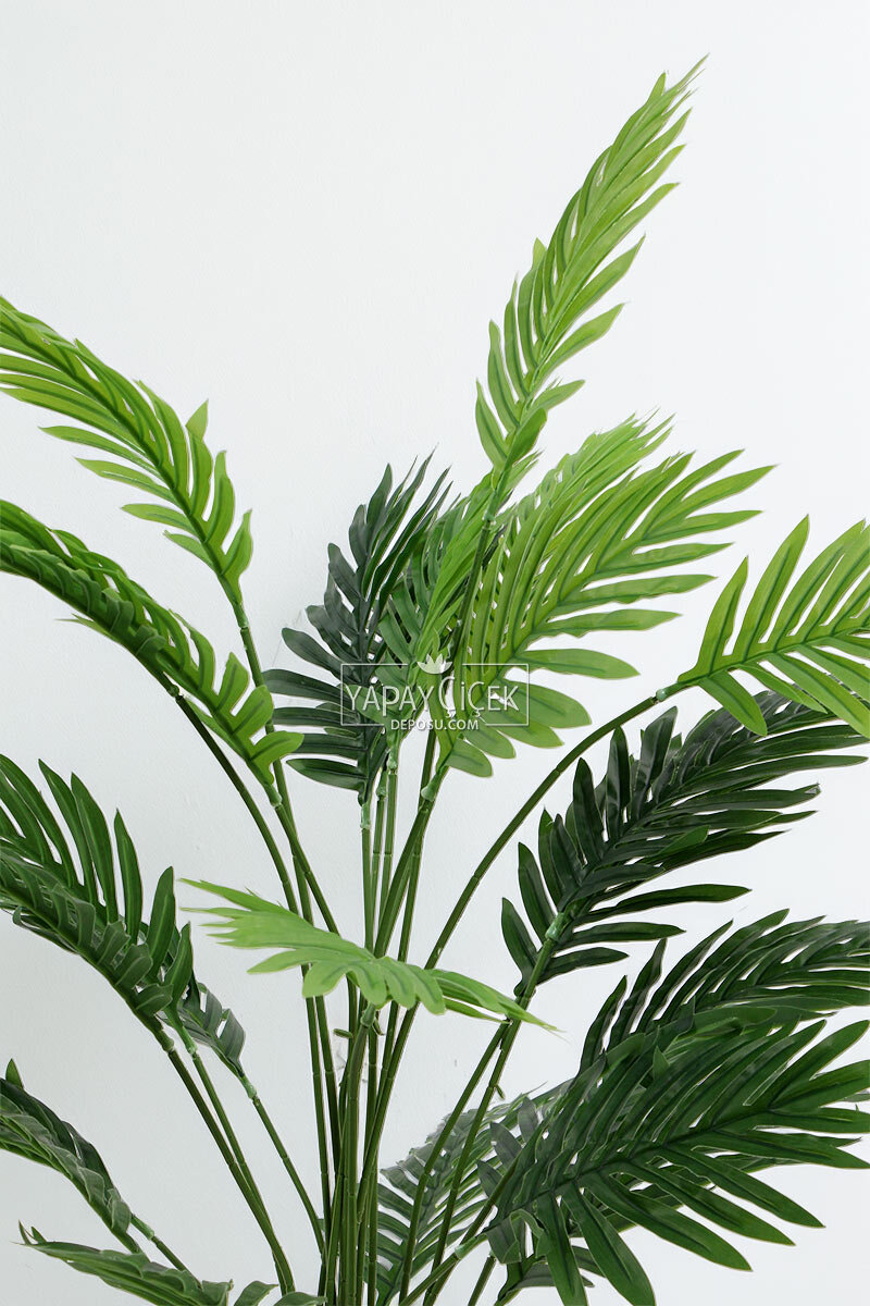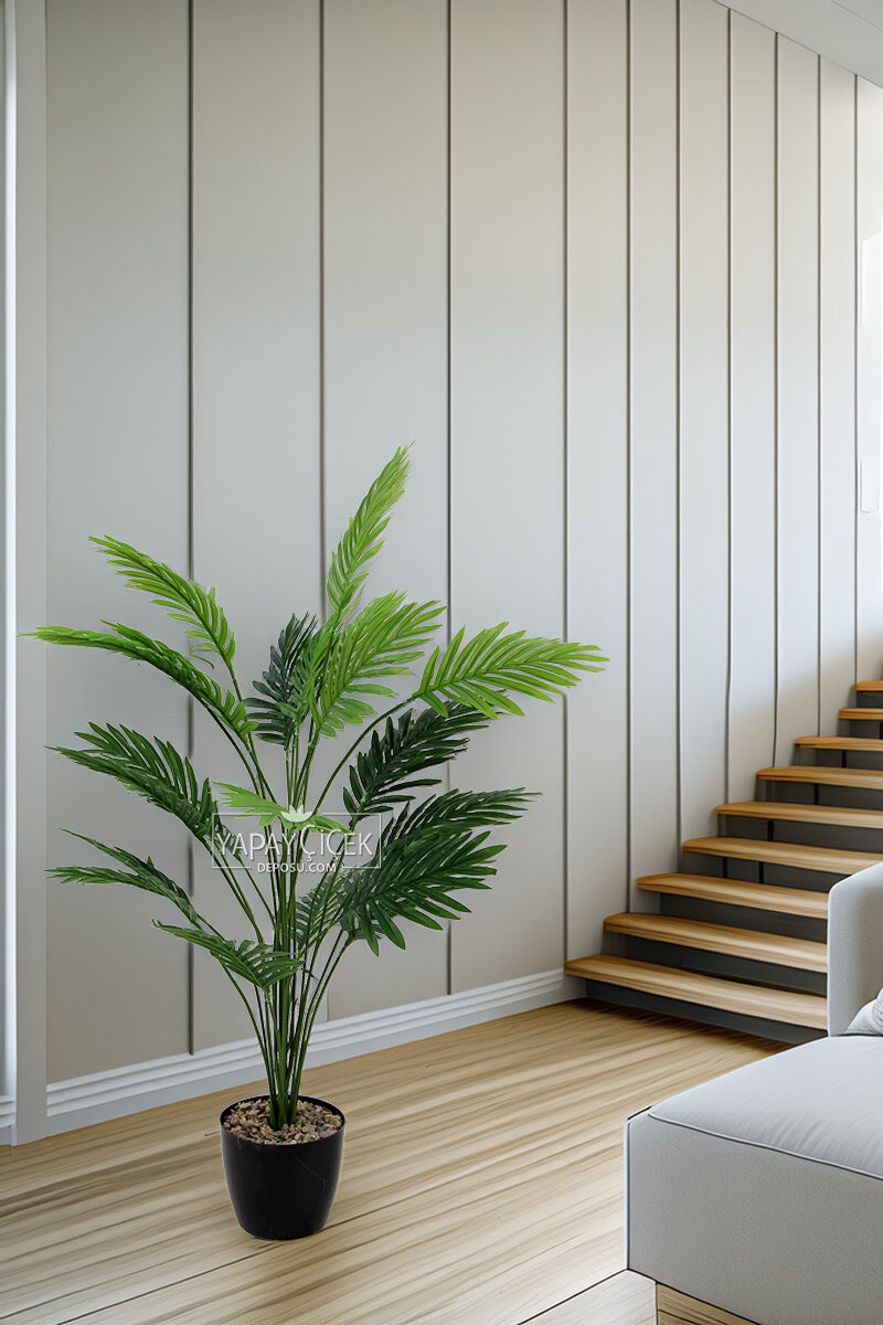 Yapay Palmiye Ağacı, 95 cm boyunda tropikal doğanın zarafetini yaşam alanlarına taşıyor. Gerçek palmiyenin dokusunu andıran canlı yeşil yaprakları, mekâna ferahlık ve hareket kazandırırken; kompakt boyutu sayesinde dar alanlarda bile etkileyici bir görünüm sunar. Siyah saksısı ve taş süslemeleri, ürüne hem modern hem de doğal bir estetik katar. Bakım gerektirmeyen yapısıyla ev, ofis, kafe gibi alanlar için zahmetsiz bir dekor çözümüdür. Doğallığı arayan ancak pratiklikten ödün vermek istemeyenler için ideal bir seçimdir.