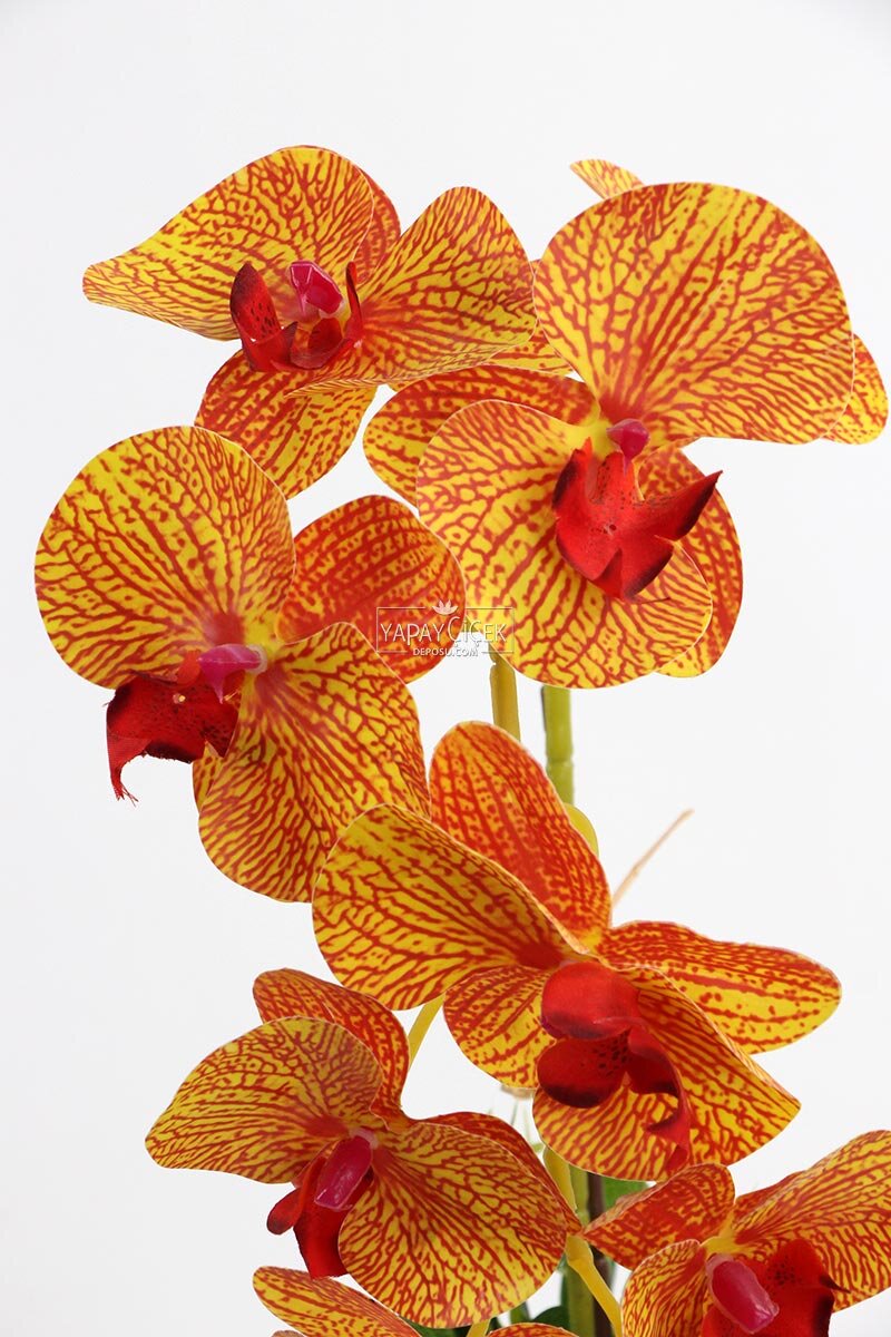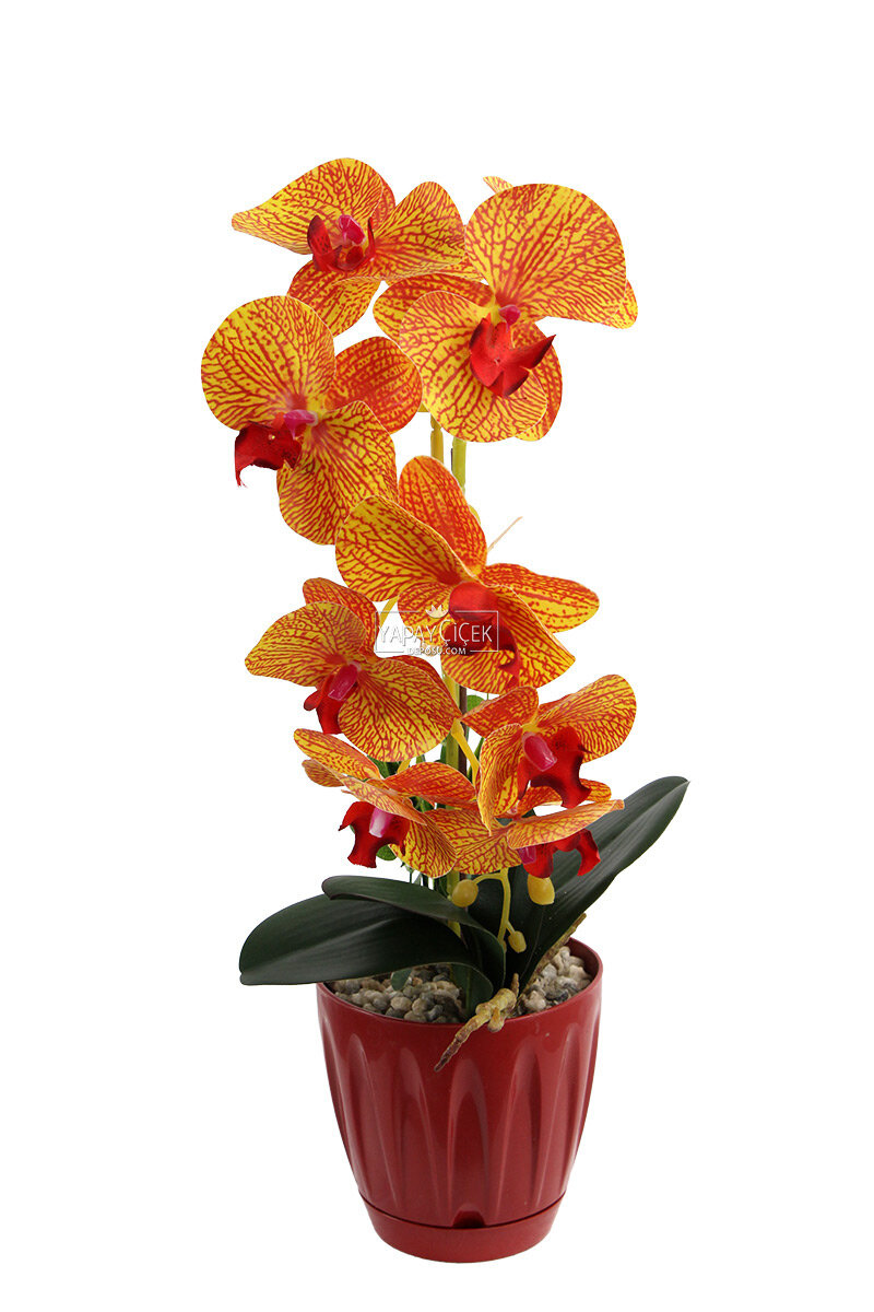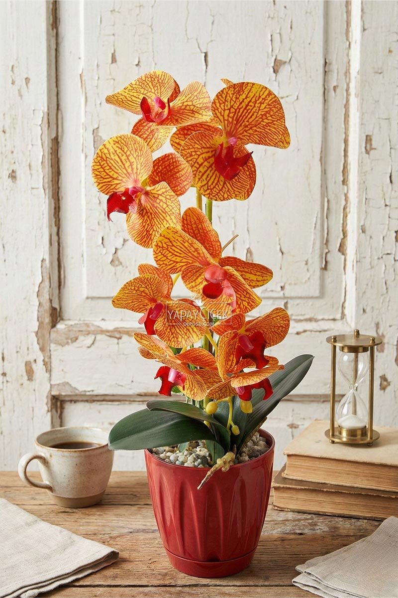 Saksıda Yapay Baskılı Islak Orkide, Turuncu çizgili dikkat çekici renk geçişleri ve gerçekçi ıslak dokusu ile bulunduğu ortama enerjik ve zarif bir hava katar. Doğal orkide görünümünü yansıtan tasarımı sayesinde hem modern hem klasik dekorasyon stillerine uyum sağlar.