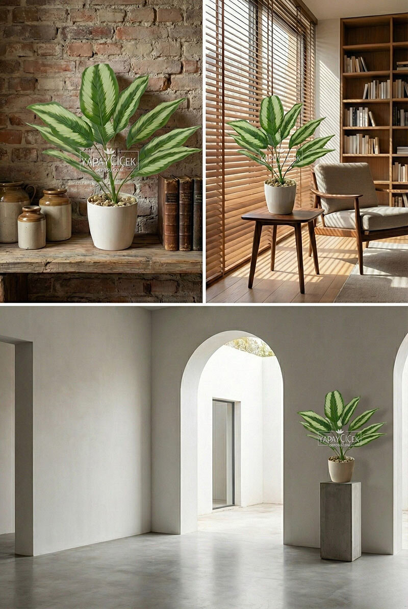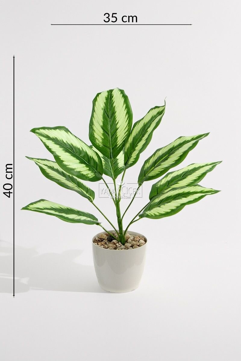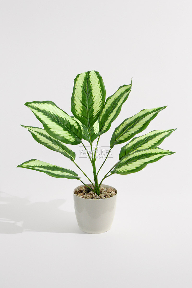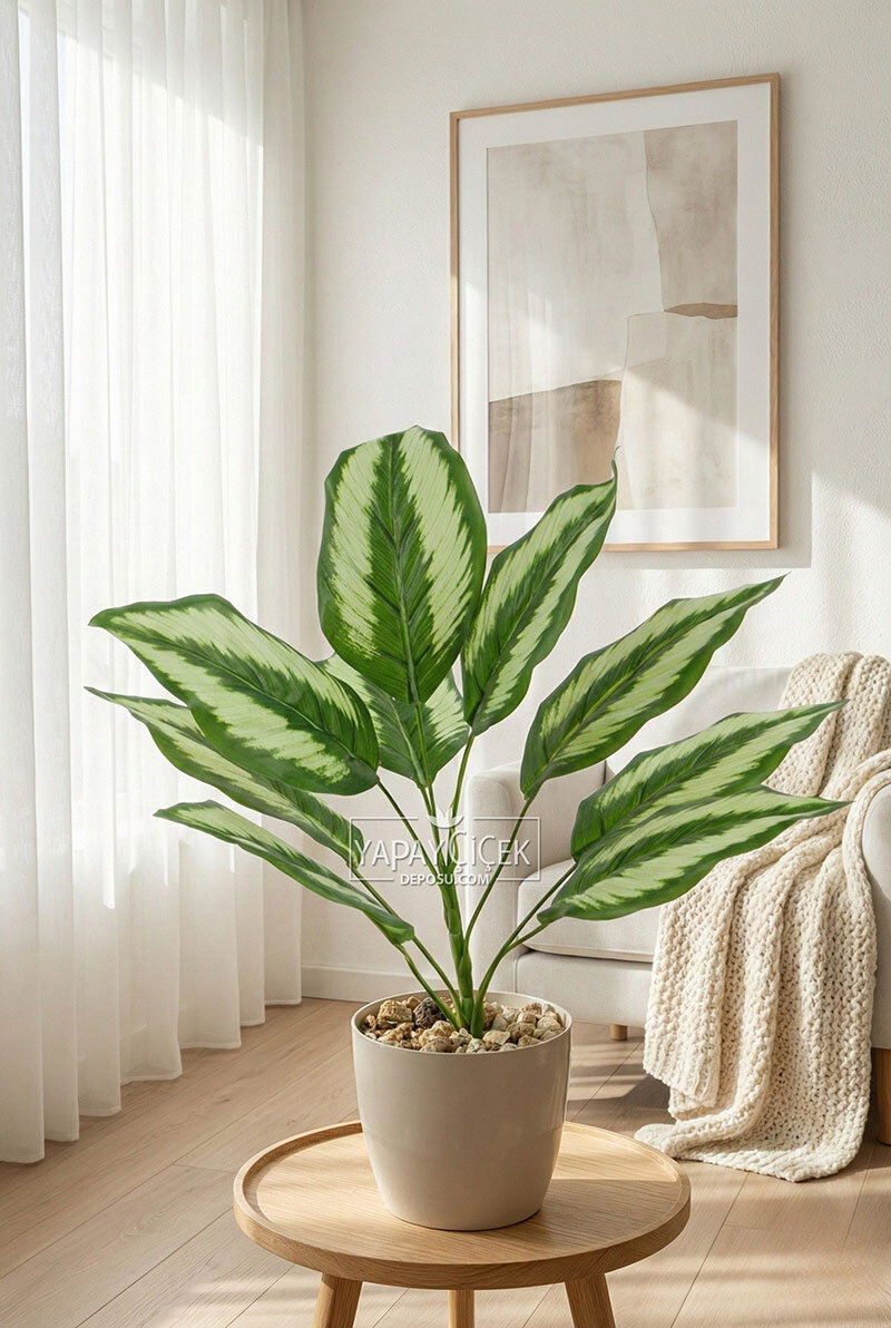 Bakım gerektirmeyen yapısı sayesinde sulama, güneş ışığı veya özel bakım istemez. Kaliteli yapay yaprakları uzun süre formunu ve canlı görünümünü korur. Beyaz saksısı ile tek başına kullanıma hazır olup, farklı dekorasyon stilleriyle kolayca uyum sağlar.