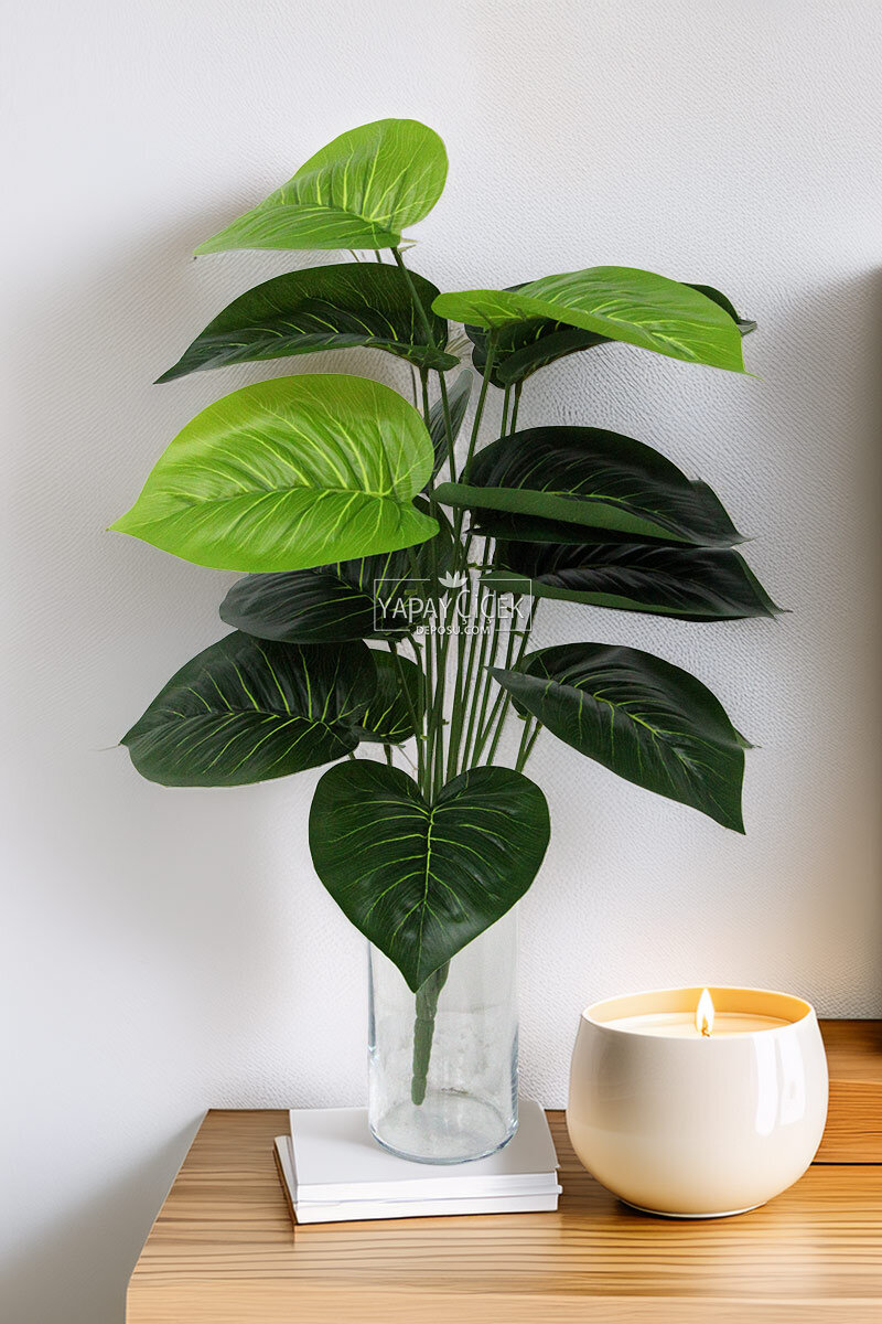 Orta boy ölçüsü sayesinde salon, oturma odası, ofis, çalışma alanları, raf ve dresuar dekorasyonlarında rahatlıkla kullanılabilir. Tek başına dekoratif bir vurgu oluştururken, diğer yapay bitkilerle birlikte kullanıldığında mekâna derinlik ve bütünlük kazandırır.