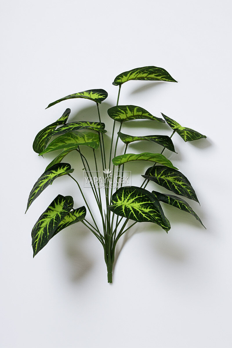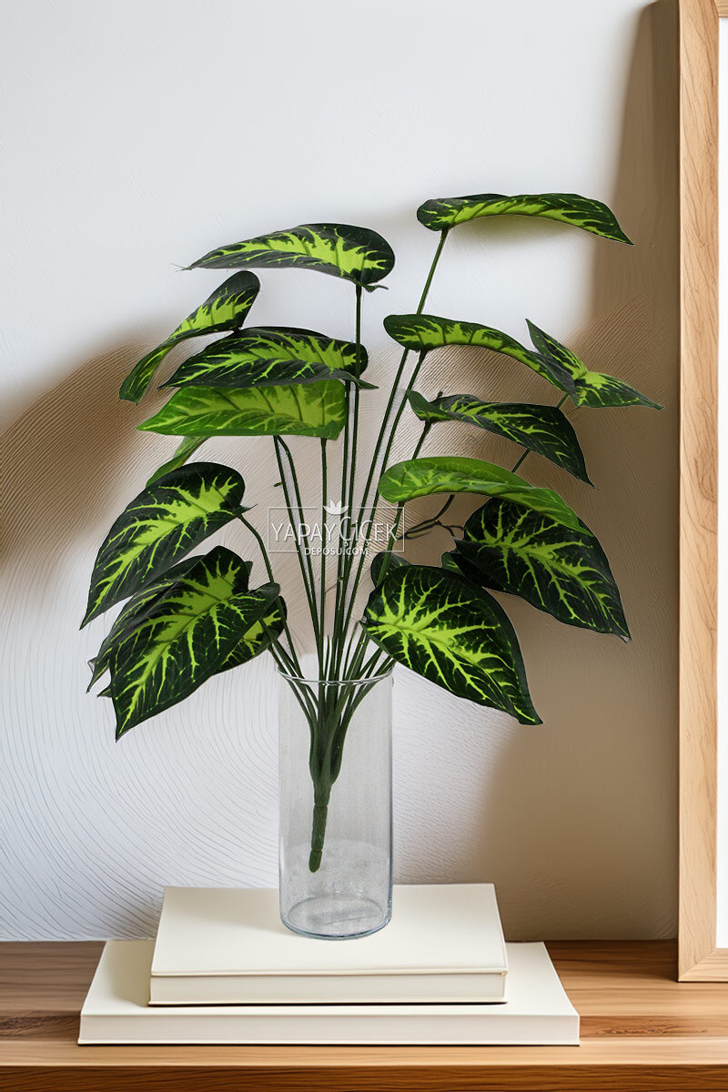 Yapay Bitki 18 Yapraklı Midori 60 cm, dolgun yaprak yapısı ve doğal formuyla iç mekân dekorasyonlarına ferahlık ve canlılık katan şık bir dekoratif bitkidir. 18 yapraktan oluşan dengeli tasarımı sayesinde orta boy ölçülerine rağmen hacimli ve estetik bir görünüm sunar.