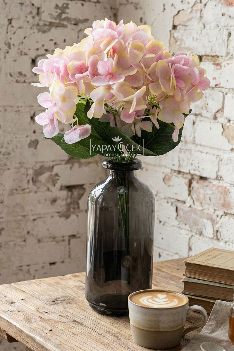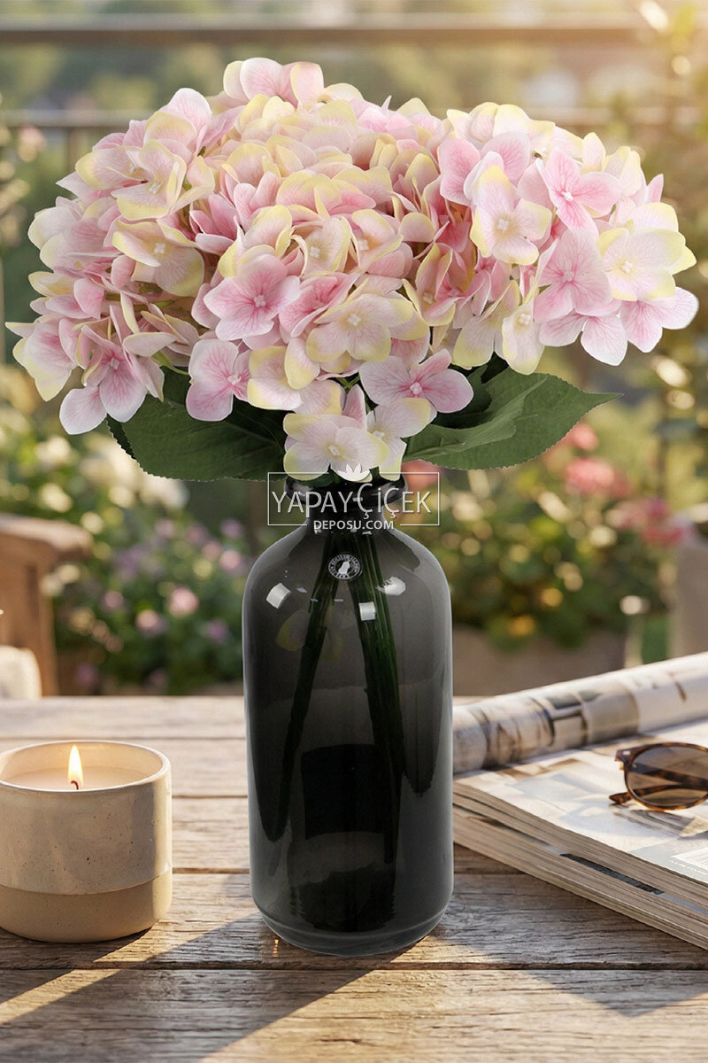 Yapay Çiçek 5 Dal Islak Cornales Damarlı Ortanca Demeti 45 cm Pembe-Sarı