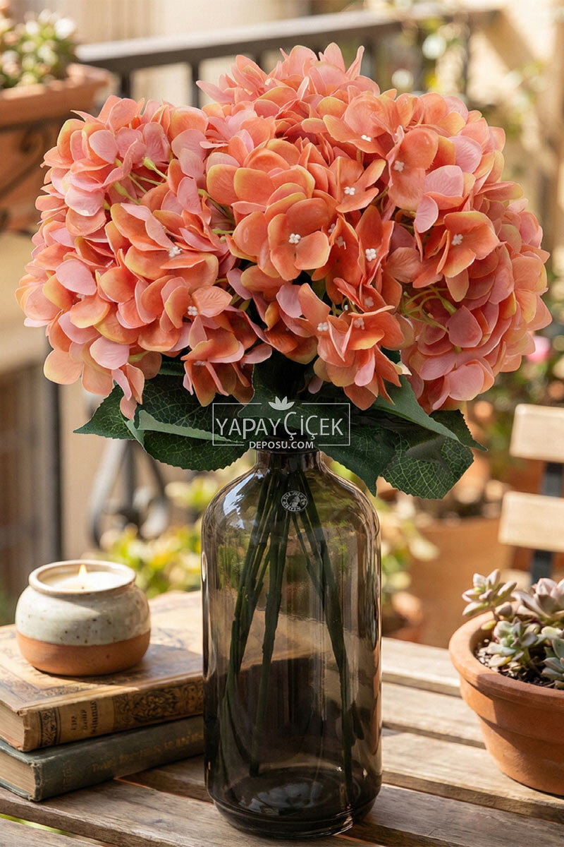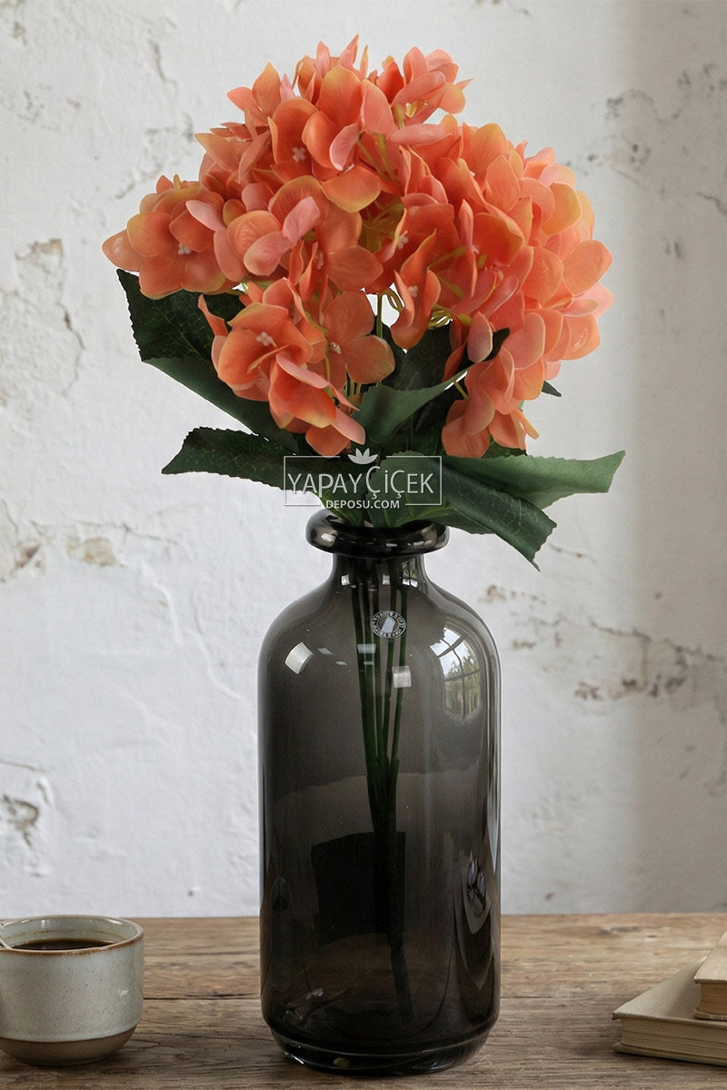 Yapay Çiçek 5 Dal Islak Cornales Damarlı Ortanca Demeti 45 cm Turuncu