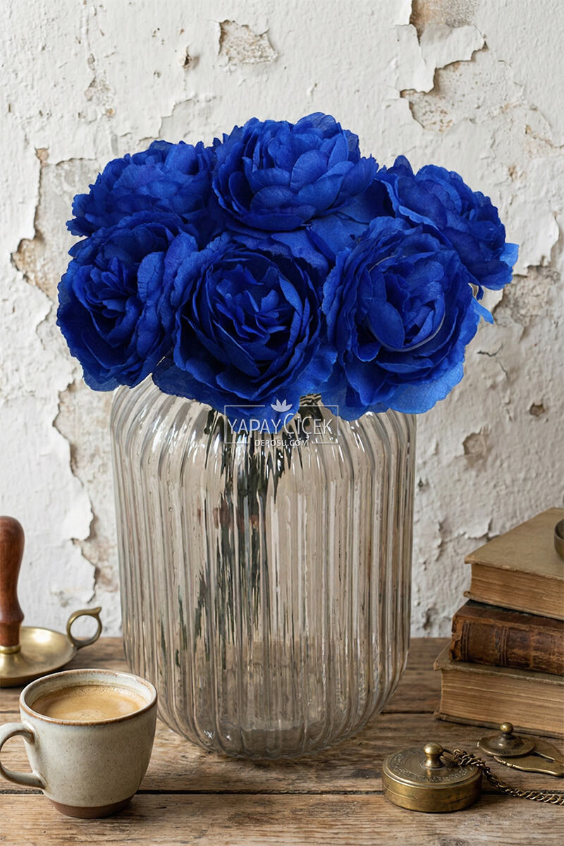 Yapay Çiçek 7li Çay Gülü Demeti 30 cm Saks Mavi