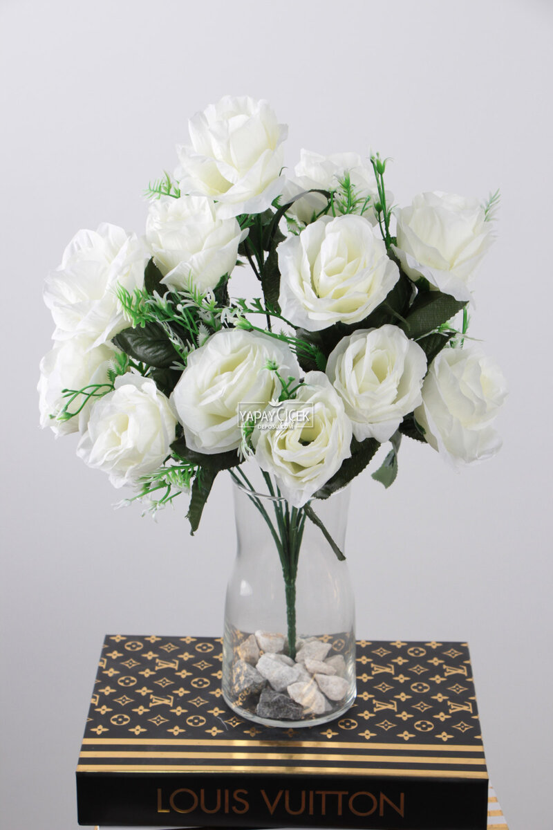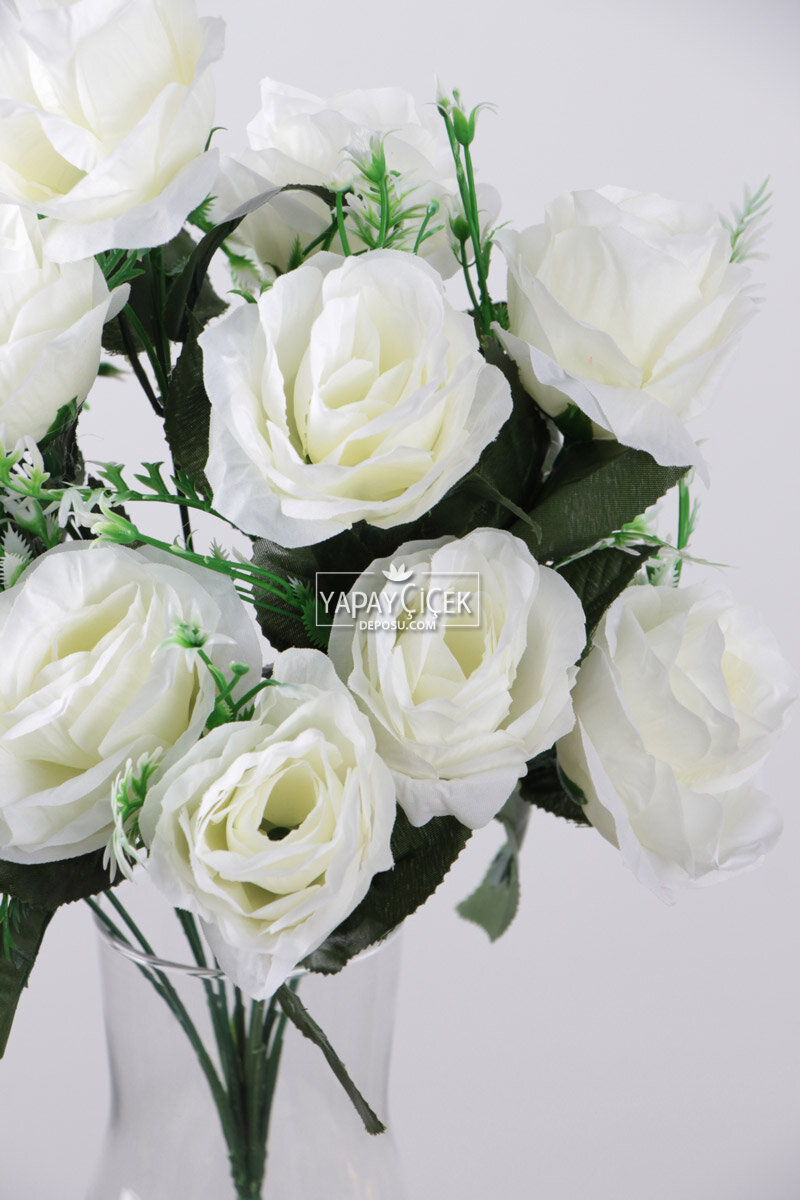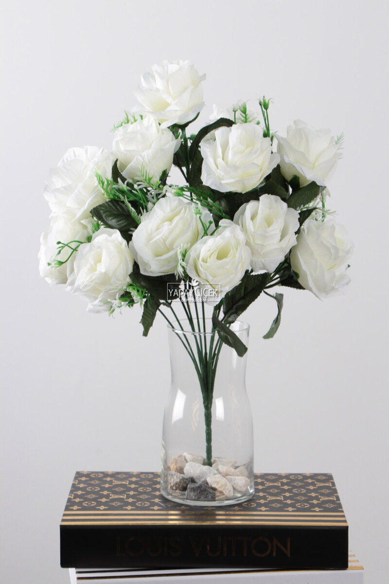 Yapay Çiçek Açmış 12li Gül Buketi kumaş malzemeden üretilmiştir. Bir demette 12 dal her dalda 7 cm çapında 1 adet gül bulunmaktadır. Yapay gül demetinde ayrıca ara dallar, cipsolar ve yapraklar yer almaktadır. Yapay Çiçek demeti çok canlı renklere sahiptir. Yapay çiçek demetini istediğiniz şekilde parçalayıp bölebilir ve istediğiniz şekilde kendi süsleminizi yapabilirsiniz. Yapay Çiçek Gül Buketi şekli itibari ile gelin çiçeği yapımına çok uygundur. Ürün yapay olduğundan çok uzun ömürlüdür dış mekan kullanıma uygundur. Çok uzun yıllar kullana bilirsiniz en küçük deforme ya da bozulma olmaz.