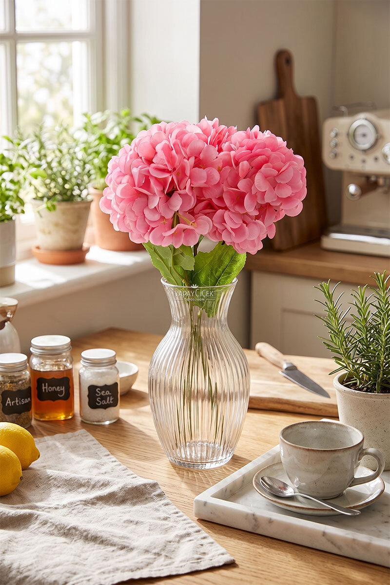 Gerçekçi ortanca dokusu ve detaylı yaprak yapısıyla doğal bir görünüm sunar. Yapay olması sayesinde bakım gerektirmez, solma veya dökülme yapmaz. Uzun süre formunu koruyarak dekorasyonlarınıza kalıcı bir şıklık kazandırır.