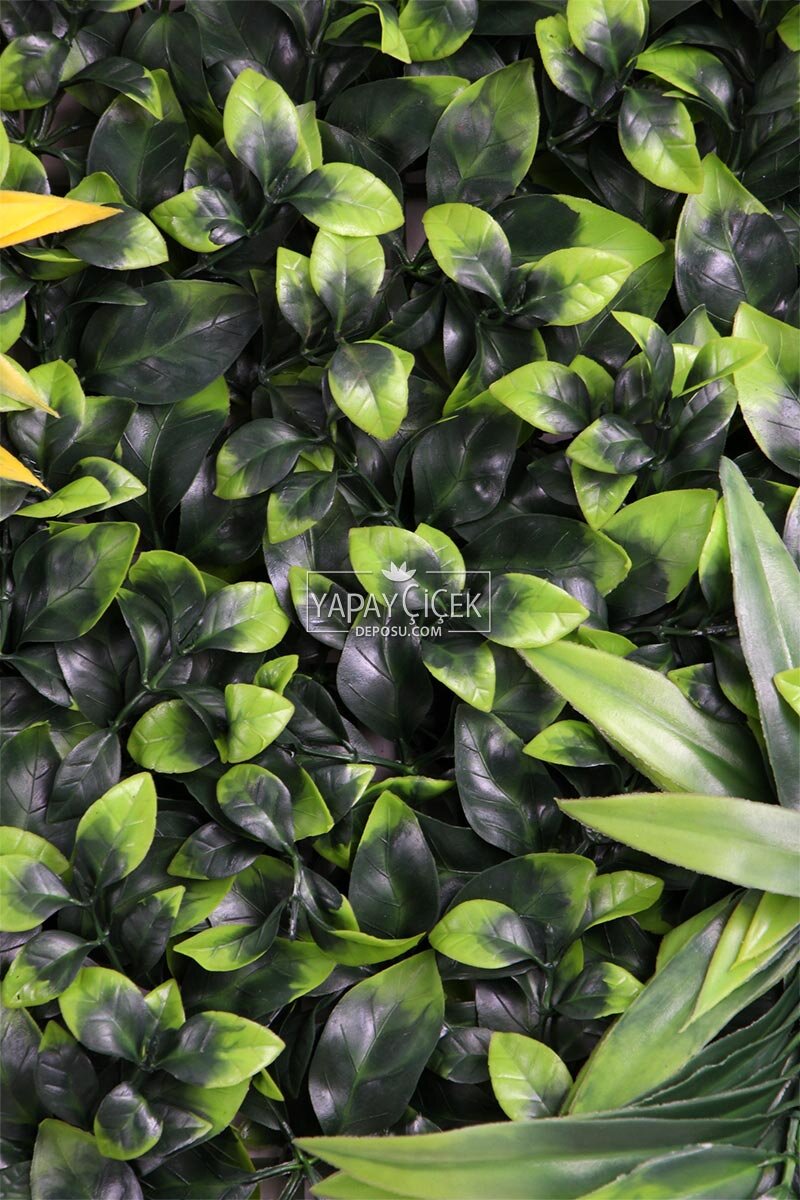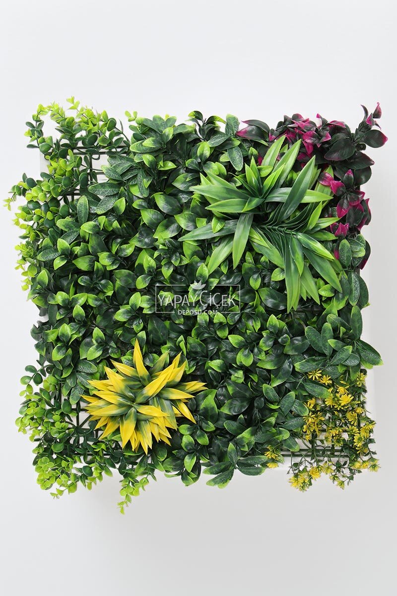 Yapay Kabarık Bitki Duvarı 50 × 50 cm, yoğun ve kabarık yaprak dokusuyla duvar dekorasyonlarına canlı, modern ve dikkat çekici bir görünüm kazandırır. Yeşil, mor ve sarı tonlarının uyumlu geçişleri sayesinde mekâna enerjik ve dinamik bir atmosfer katar.