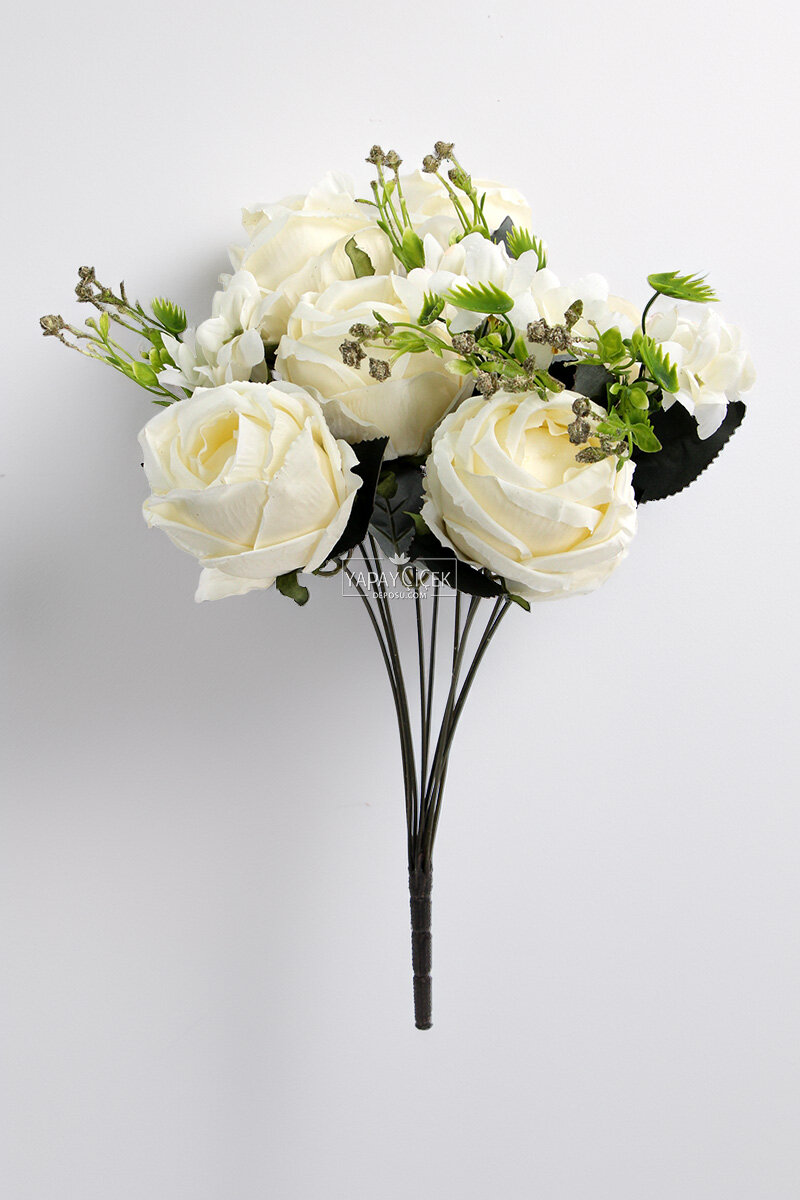 6 dalda büyük katlı güller, 4 dalda ortanca, cipso, garnitür ve yeşillik ara dallar bulunur.