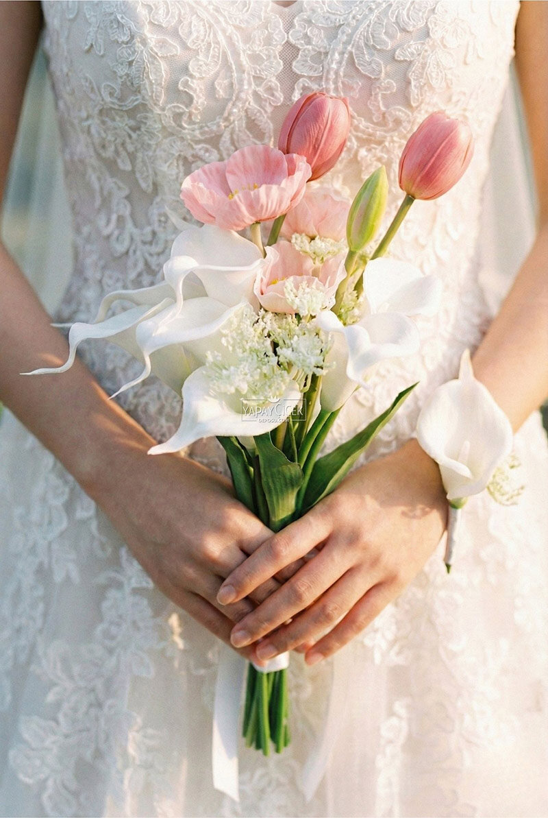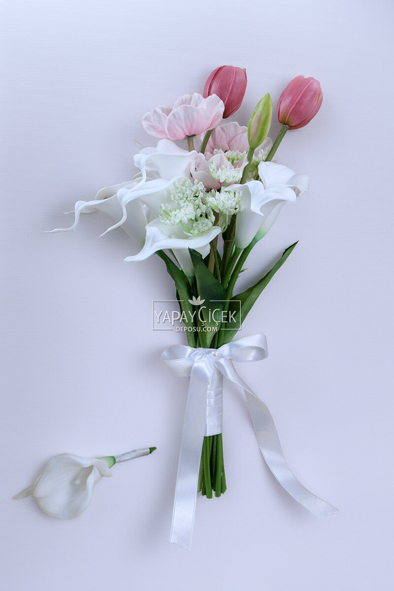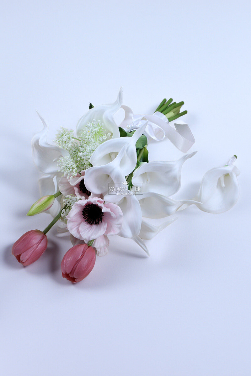 Nazende Premium Gala-Lale Gelin Buketi 2’li Set, zarif tasarımı ve modern çizgileriyle özel günlerinizde şıklığınızı tamamlamak için özenle hazırlanmıştır. Gala ve lale uyumunun sunduğu sade ama etkileyici görünüm, gelin konseptlerine sofistike bir dokunuş katar. Kaliteli yapay çiçek yapısı sayesinde formunu uzun süre korur, solma yapmaz ve hatıra olarak saklanabilir. Set içeriğinde gelin buketi ve damat yaka çiçeği yer alır.