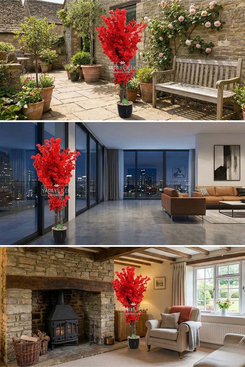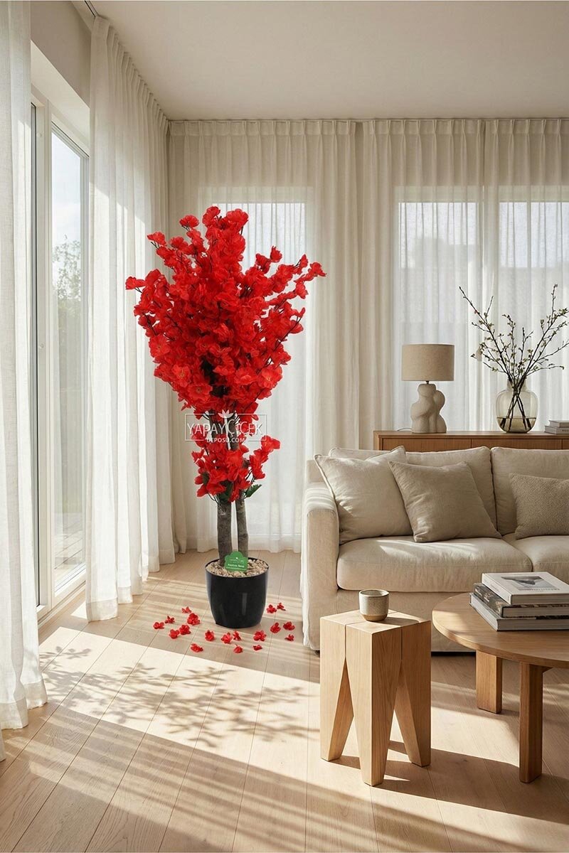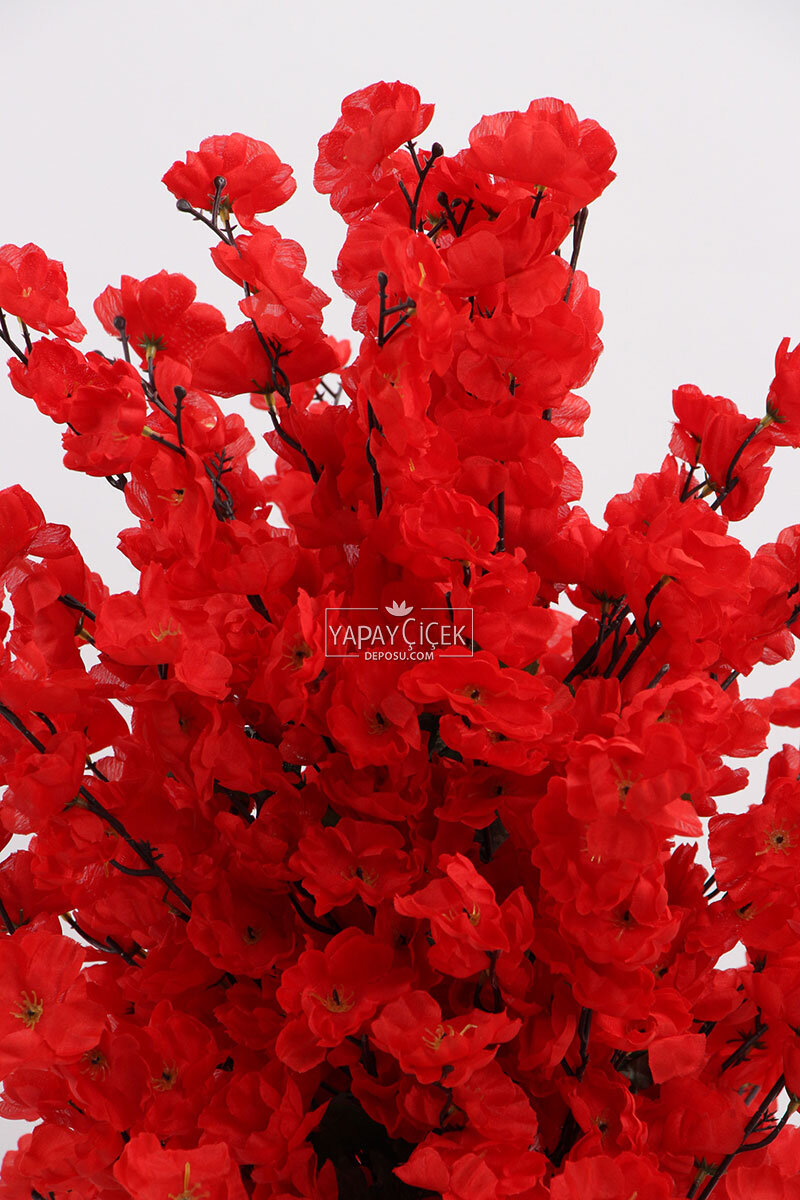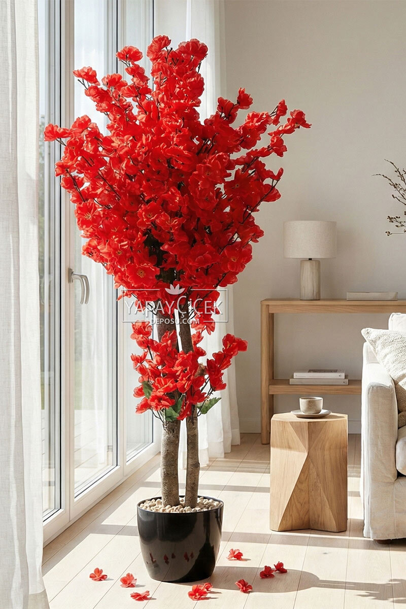 Saksıda Yapay 2 Gövdeli Bahar Dalı Ağacı 100 cm Kırmızı