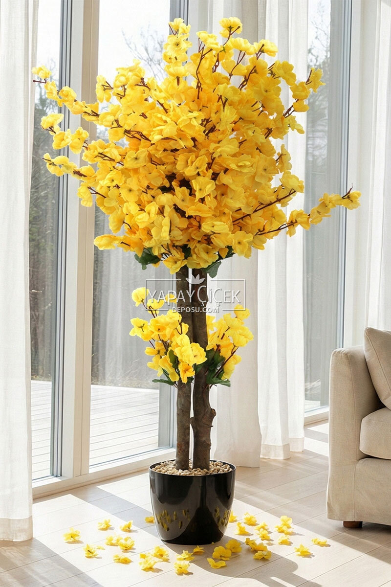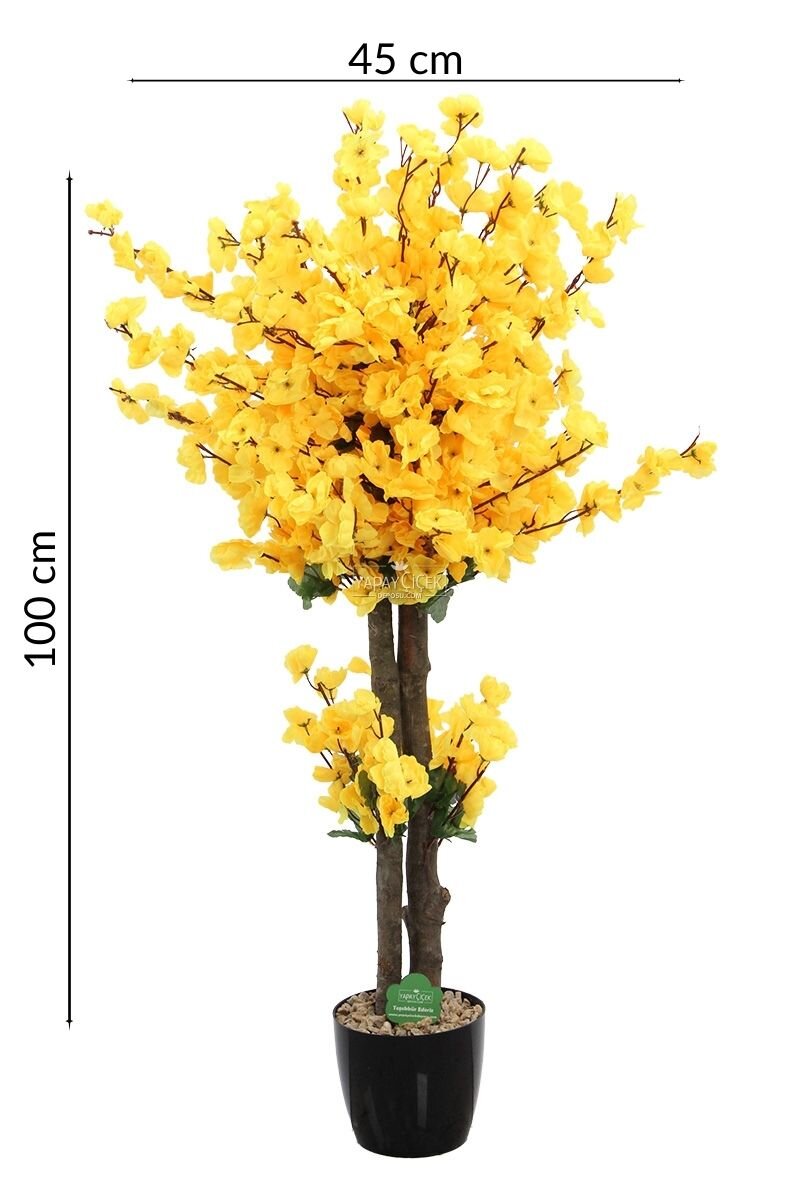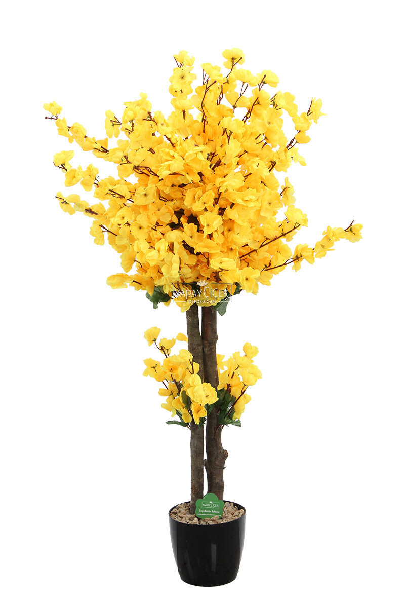 Saksıda Yapay 2 Gövdeli Bahar Dalı Ağacı 100 cm Sarı
